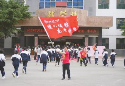 6月7日,隆尧县第一中学高考考点,值班老师举着写有“旗开得胜高考圆梦”的旗子给学生助威加油。 潘志方、梁亚飞摄