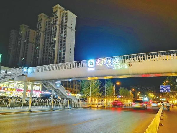当夜幕降临,天桥上的邢台城市品牌图案标识和字体标识,随周边照明夜景设施一同点亮,进一步彰显了城市品牌、展示了城市风貌、丰富了城市活力。