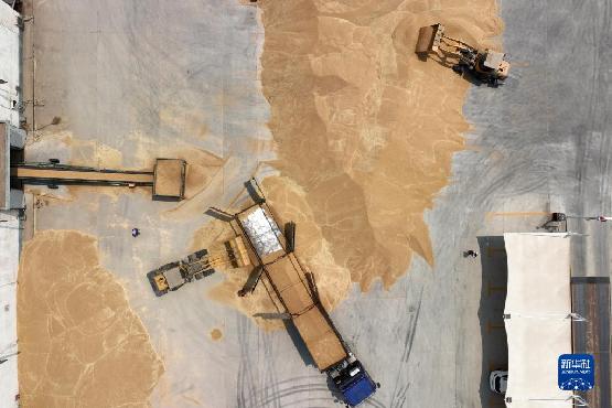 6月18日,在位于柏乡县的河北金谷源粮油集团股份有限公司,作业车辆正在将收购的小麦入库(无人机照片)。时下,河北省邢台市柏乡县的夏粮收购工作全面展开,粮食企业忙着进行称重过磅、抽样检测、卸车入库等工作,确保小麦颗粒归仓。新华社记者 牟宇 摄