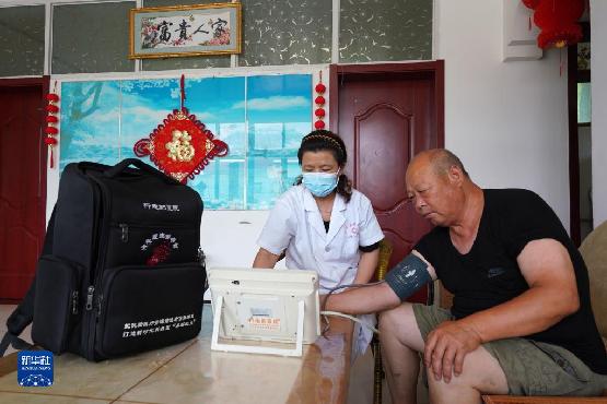 6月25日,河北省柏乡县十里铺村卫生室村医使用全科医生助诊包内的设备为村民量血压。近年来,河北省柏乡县实施“行走的医院”项目,为全县121个行政村的乡村医生配备了全科医生助诊包等设备。利用全科医生助诊包,村医可为村民进行血液化验、尿液检验、心电图检查、超声检查等检测项目,并可通过设备实时向柏乡县中心医院医生问诊,将优质医疗资源送到群众家门口。新华社记者 牟宇 摄