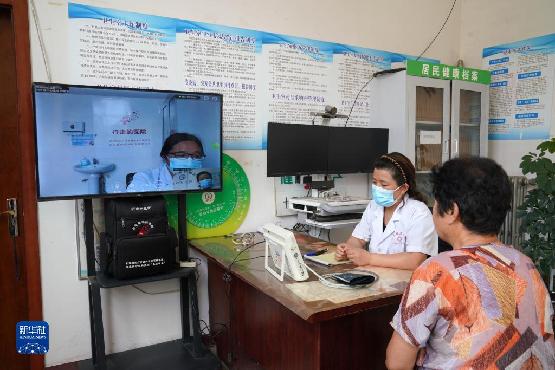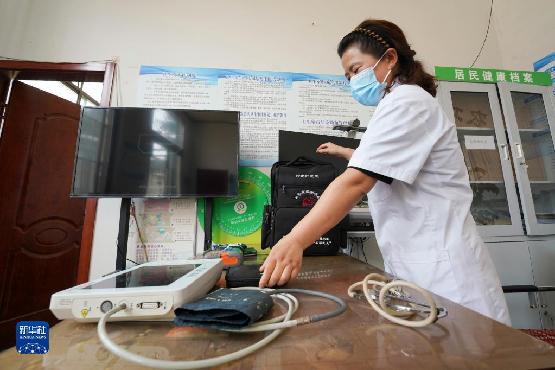 6月25日,在河北省柏乡县十里铺村卫生室,村医使用全科医生助诊包内的设备与柏乡县中心医院医生在线沟通患者病情。近年来,河北省柏乡县实施“行走的医院”项目,为全县121个行政村的乡村医生配备了全科医生助诊包等设备。利用全科医生助诊包,村医可为村民进行血液化验、尿液检验、心电图检查、超声检查等检测项目,并可通过设备实时向柏乡县中心医院医生问诊,将优质医疗资源送到群众家门口。新华社记者 牟宇 摄