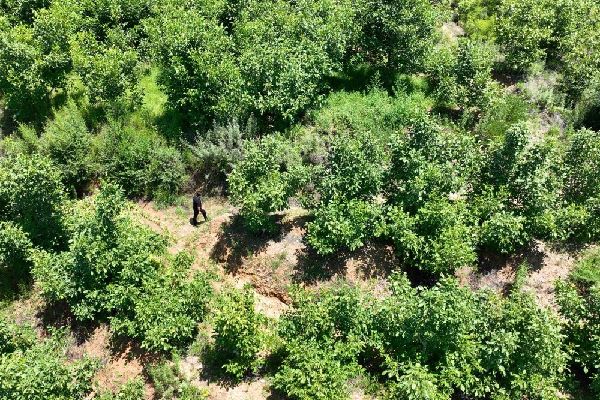 ↑6月30日,贾志华在河北省临城县贾庄村查看核桃长势(无人机照片)。