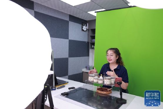 ↑ 7月11日,内丘县一家传媒公司的员工通过直播推介中药材产品。