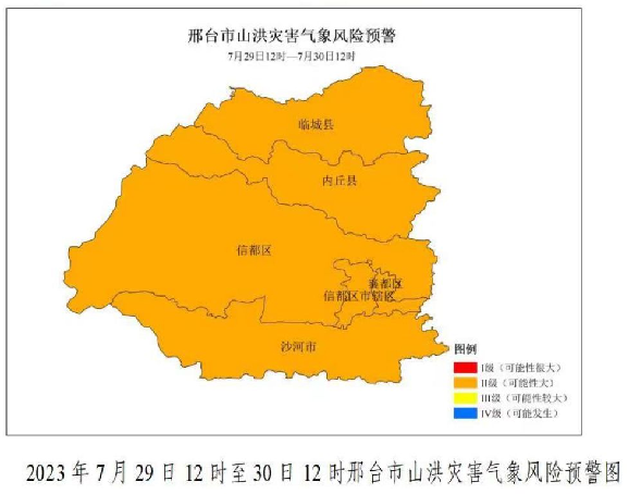 2023年7月29日12时邢台市水务局和邢台市气象局联合发布邢台市山洪灾害气象风险预警:29日12时至30日12时,邢台市临城县、内丘县、信都区、沙河市山洪灾害气象风险等级为Ⅱ级,发生山洪灾害可能性大。