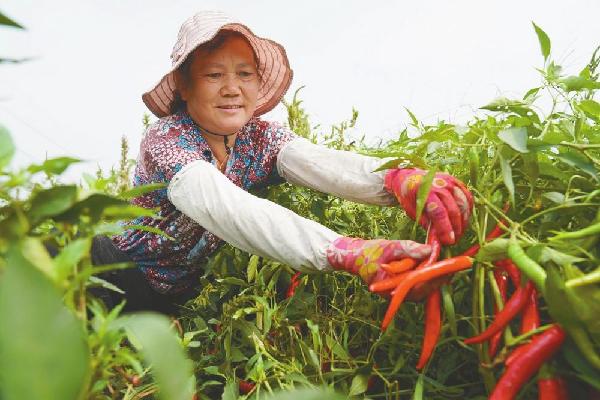 9月13日,市经开区王快镇河会社区股份经济合作社社员在采摘辣椒。