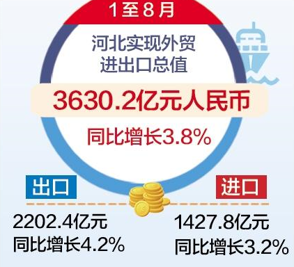 河北日报讯(记者苑立立 通讯员解博匀)据石家庄海关统计,1至8月,河北实现外贸进出口总值3630.2亿元人民币(下同),同比增长3.8%,增速高于同期全国外贸进出口整体增速3.9个百分点。其中,出口2202.4亿元,同比增长4.2%;进口1427.8亿元,同比增长3.2%。