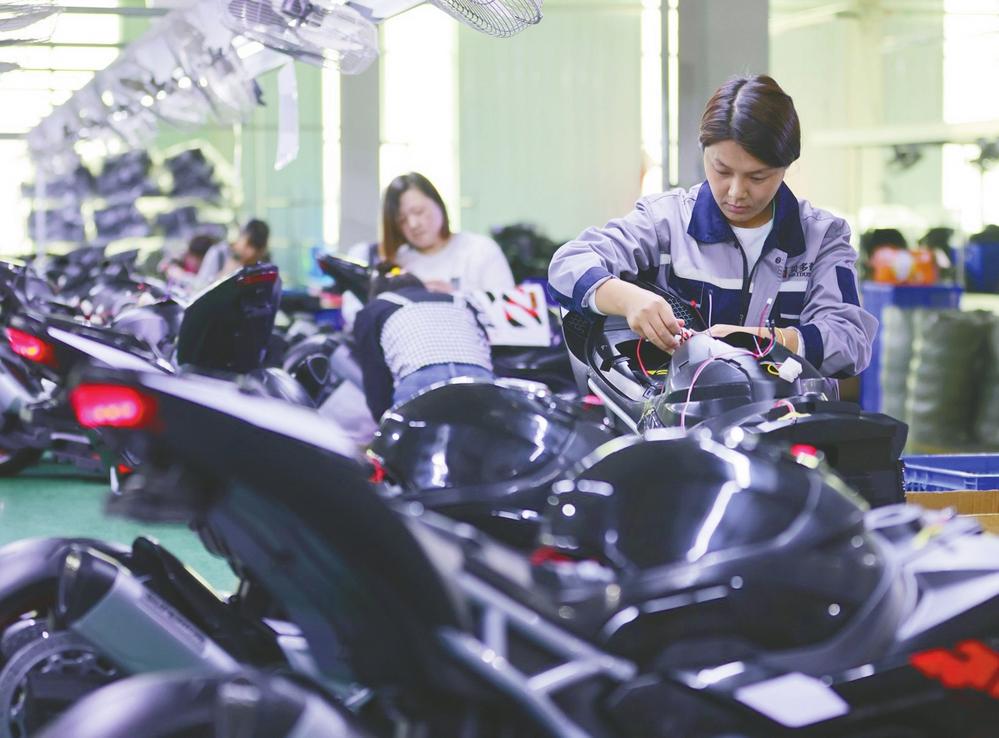 图为河北贝多奇儿童玩具有限公司生产车间,工人在组装电动摩托车。
