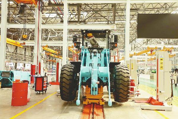 河北长征汽车制造有限公司总装车间内,工人正在装配新能源装载机。檀雪摄