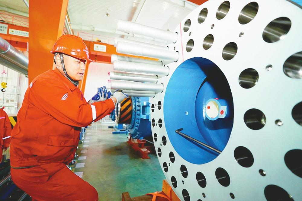 近年来,市经开区以绿色低碳发展为导向,大力发展新能源产业,通过招引光伏组件、动力电池、风电装备等领域的新能源企业,不断完善风电、光伏全产业链,推动绿色产业集群加速聚集。目前,市经开区拥有国家级绿色工厂2家、省级绿色工厂4家。图为邢台金风科技有限公司工人正在安装拼接螺栓。