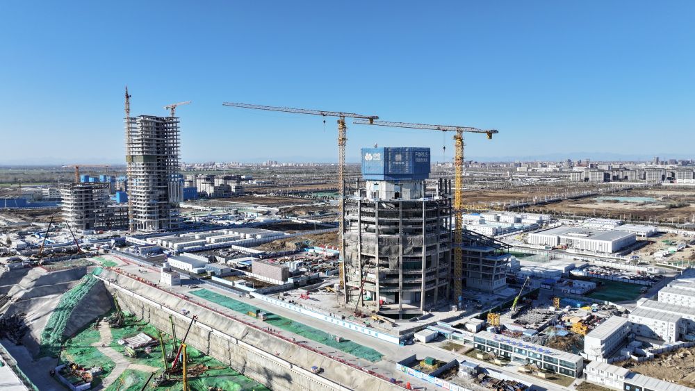 时值冬季,雄安新区启动区塔吊升降、机器轰鸣、钢筋敲击声不绝于耳,工人们顶着寒风高效施工。