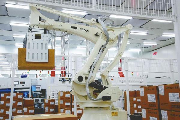在晶澳公司6GW高效太阳能电池智能生产车间,六轴机器人正在打包电池片。张明明、侯爱强摄