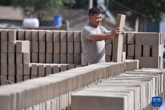 5月15日,陈建磊在摆放准备烧制的青砖。 新华社记者王晓摄