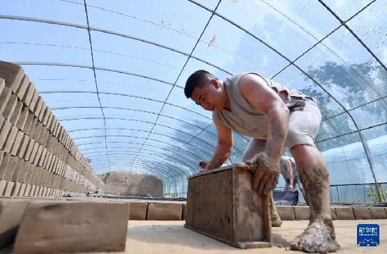 5月15日,陈建磊在制作砖坯。 新华社记者王晓摄