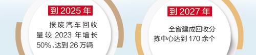 方案提出具体目标,到2025年,报废汽车回收量较2023年增长50%,达到26万辆,废旧家电回收量较2023年增长15%,达到850万台(套);到2027年,报废汽车回收量较2023年增加一倍,达到35万辆,二手车交易量较2023年增长45%,达到260万辆,废旧家电回收量较2023年增长30%,达到960万台(套)。