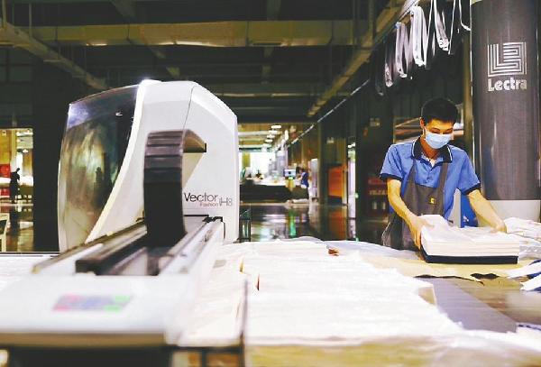 近日,在宁晋县童泰婴幼儿服饰有限公司的裁剪车间,工人在整理自动化裁床裁剪的布料。