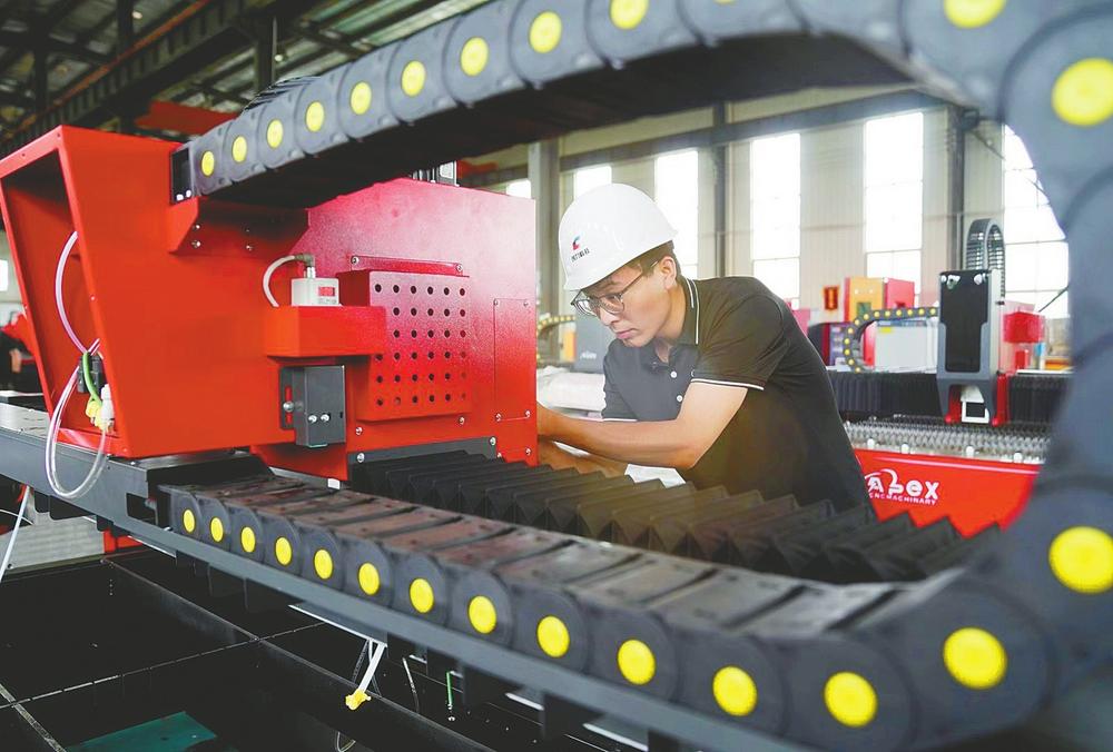 图为工人在河北创力机电有限公司的生产车间装配数控激光切割机。周林、李院红摄