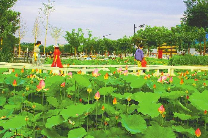 日前,在牛尾河公园的荷塘,荷花已进入盛开期。正所谓“接天莲叶无穷碧,映日荷花别样红。”大片荷叶衬托着姿态各异的荷花,有的含苞待放,有的只展开几片花瓣,有的已全部盛开……荷塘清香飘荡,吸引众多市民纷纷前来打卡。(于海波 白瑞英摄)