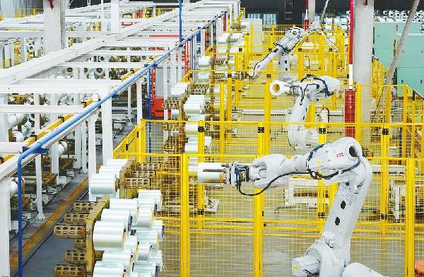 近日,在位于沙河市的冀中能源集团河北冀中新材料有限公司生产车间内,自动卸纱机械手正在工作。