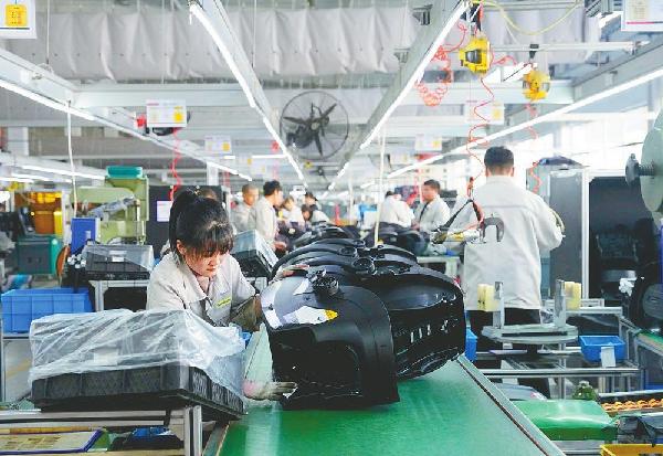 近日,在平乡县一家童车企业,工人正在组装童车赶制外贸订单。