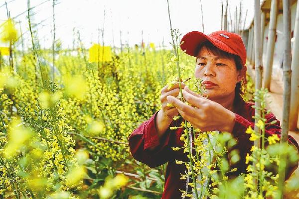 4月10日,市经开区留西村村民为甘蓝进行人工授粉。留西村培育的60多种甘蓝种子销往北京、天津、广东等地,还出口至俄罗斯、印度、巴基斯坦、越南等国家。