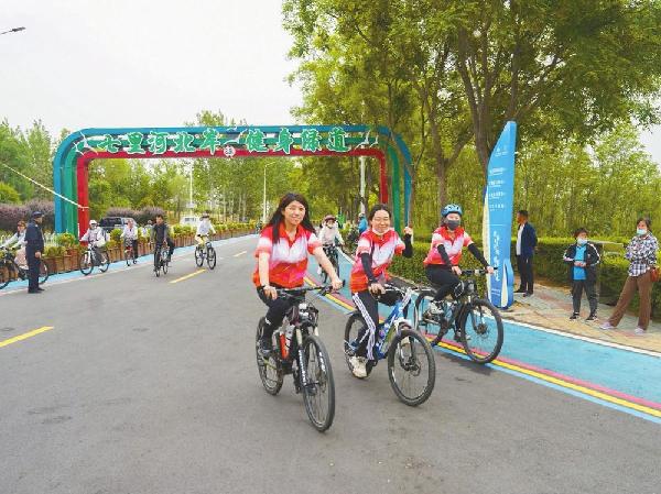4月30日,参与骑行活动的人员在七里河北岸健身绿道骑行。 韩文洲摄
