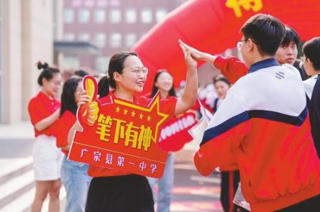 6月7日,广宗县第一中学考点,送考老师与考生互动加油。张驰、侯志营摄