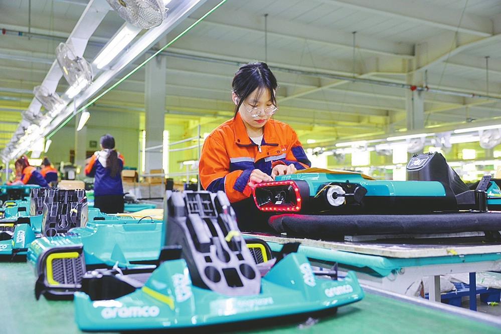 近日,工人在广宗县贝多奇儿童玩具有限公司车间生产线上组装电动儿童玩具车。