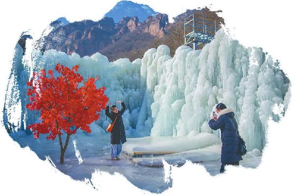 1月13日,游客在北武当山冰瀑前游玩拍照。近日,沙河市北武当山景区依托自然地貌打造的30余亩冰瀑群正式亮相,形态各异的冰柱、冰挂在蓝天映衬下壮美灵动,为游客带来别样冬日乐趣。(霍红军高儒森摄)