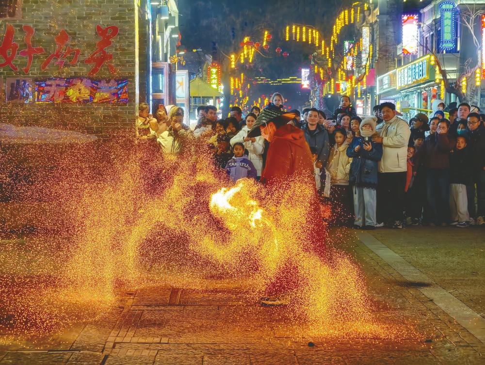 2月27日晚,好南关“火刀”“火壶”“火扇”非遗表演火热开场。火光舞动间尽显传统技艺魅力,吸引众多市民驻足观赏,提前点燃元宵节热闹氛围。 霍红军、霍勇摄