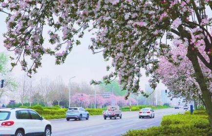 本报讯近日,市区街道、游园等地种植的西府海棠迎来盛花期,粉白相间的花朵缀满枝头,为城市增添了一抹亮丽春色。