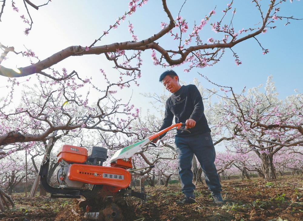 近日,果农在内丘县大都城村果园内管护果树。连日来,随着气温回升,内丘县大都城村果园内梨花、杏花竞相绽放,果农们抢抓农时,在田间耕地劳作、管护果树。