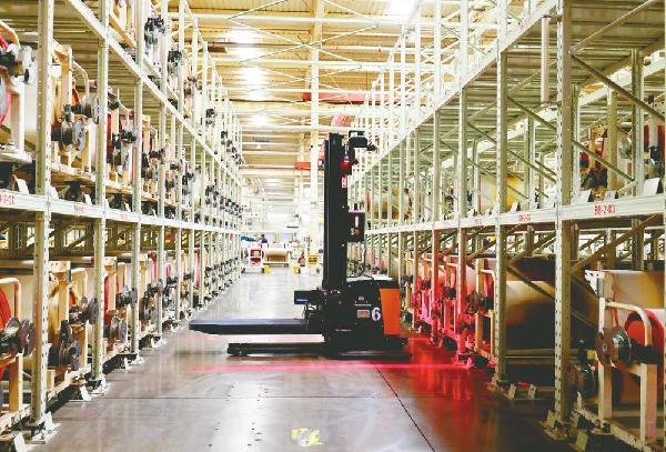 4月13日,在河北万达轮胎有限公司生产车间,智能物流搬运机器人 正在工作。王垒摄